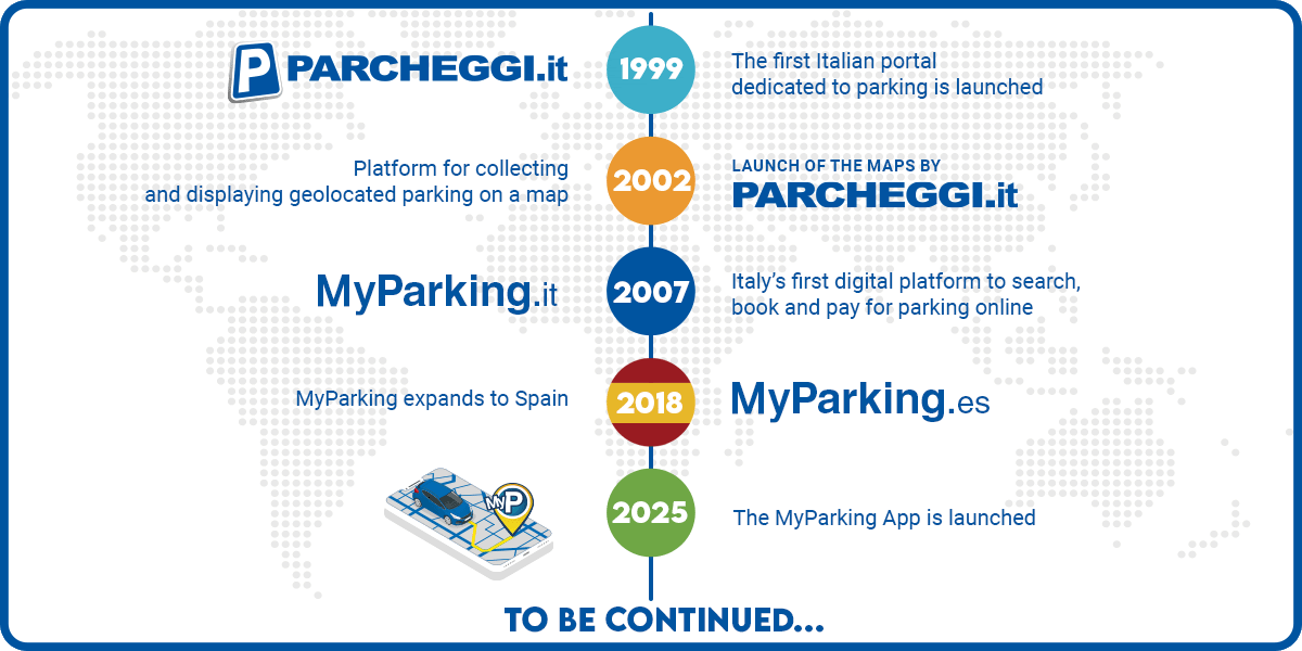 The story of MyParking began in 1999 with Parcheggi.it, the first Italian online portal dedicated to the world of parking.